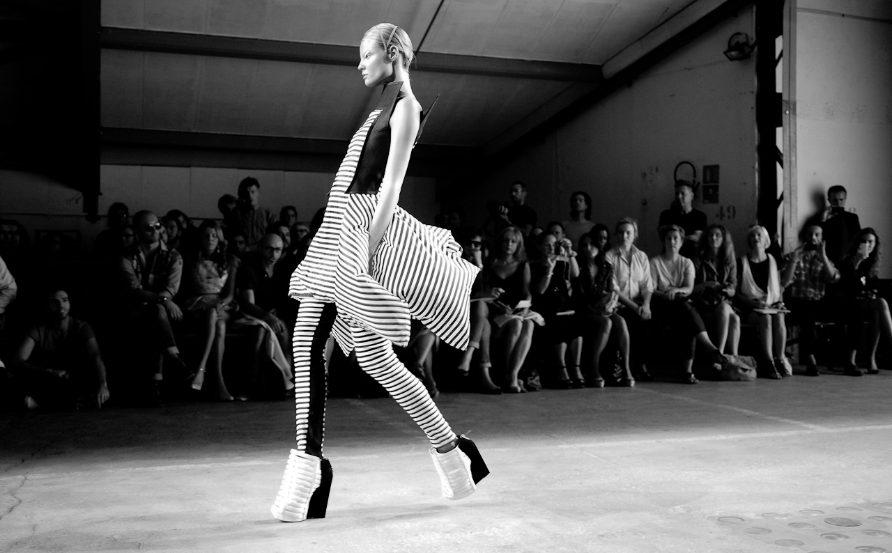 Cherchant à marier inlassablement l’art et la mode, Gareth Pugh est un poète des temps modernes qui se sert des matières pour partager sa vision du monde. Un monde gothique, semi-apocalyptique, surréaliste où ce sont les ensembles qui animent les modèles. Les modèles surgissent du néant pour prendre vie et s’illuminer sous les feux des projecteurs. On assiste à une résurrection des corps ou devrais-je dire des modèles pour donner vie aux pièces de couture.